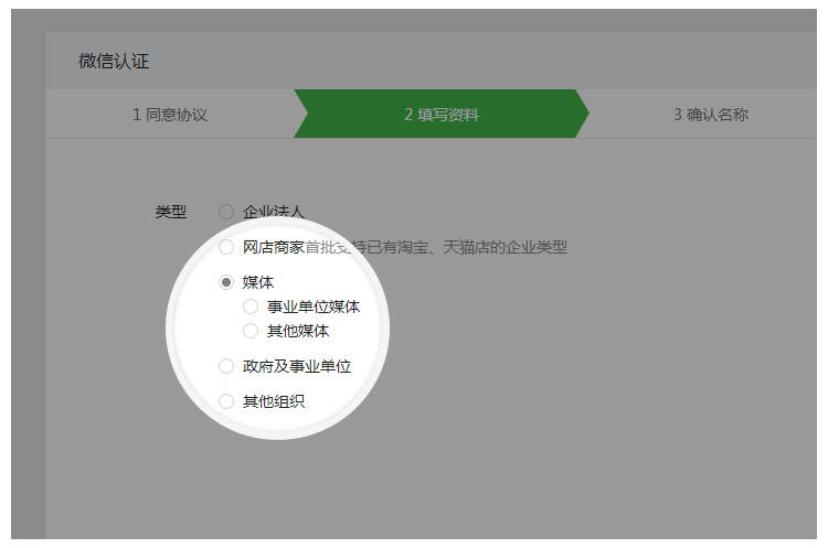 認證的政府與媒體類訂閱號是指:訂閱號在進行微信認證時,選擇的主體類型是政府或者媒體。如下圖所示: