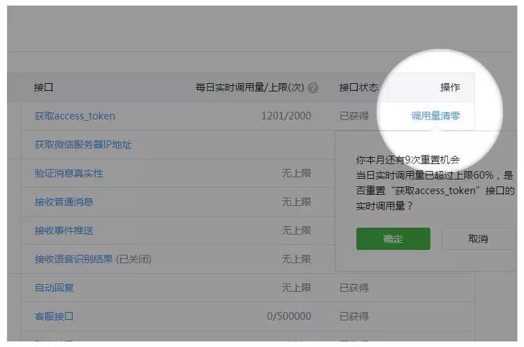2.當接口實時調用量達到該接口日可調用上限的60%及以上時,在操作一列出現“調用量清零”,開發者可根據自身需要決定是否清零。
