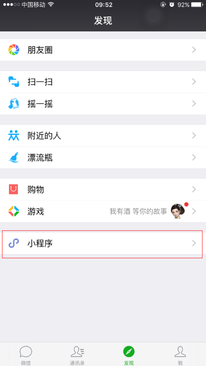 5、退出上面這個頁面,點開你的微信第三頁面“發(fā)現(xiàn)”,你會發(fā)現(xiàn),再出現(xiàn)面出現(xiàn)了小程序的入口。
