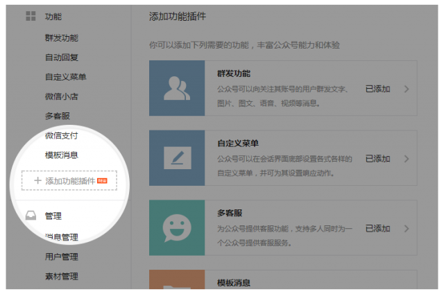 每個(gè)公眾號(hào)都可以在添加功能插件頁(yè)面,看到該帳號(hào)能申請(qǐng)的所有功能。