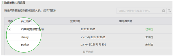 2. 選擇需要接收數據推送的操作員(說明:接收數據推送需要先登記操作員的微信號)