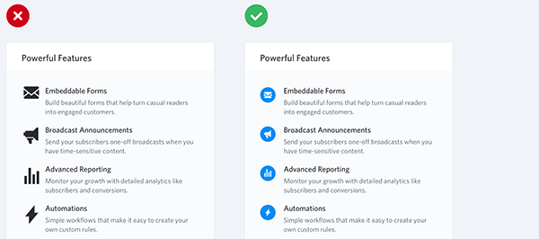 當(dāng)設(shè)計(jì)著陸頁的時(shí)候,可以會(huì)突出產(chǎn)品的功能,這時(shí)你需要一些大的圖標(biāo)作為視覺錨點(diǎn),這樣的話你很可能會(huì)去 Font Awesome 或 Zondicons 這樣的網(wǎng)站找?guī)讉€(gè)免費(fèi)的矢量圖標(biāo),然后將其放大到你所需要的尺寸。雖說矢量圖可以無損的放大,但是一個(gè)通常只有16×16 的圖標(biāo)放大三四倍,它固然無損,但是在視覺上就顯得頗為不專注了:缺乏細(xì)節(jié),總感覺過于矮胖。