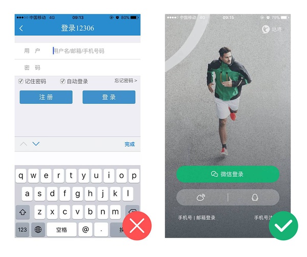 美學(xué)在設(shè)計(jì)產(chǎn)品的使用上扮演著重要的角色。美的設(shè)計(jì)能促進(jìn)人們形成正面積極的態(tài)度,而且讓人們對產(chǎn)品設(shè)計(jì)上的缺陷更具有包容性。如:同樣都是登錄頁面我們更容易接受右面的設(shè)計(jì),并且我們會(huì)通過是否美觀推斷右面的APP應(yīng)該更好用,畢竟一個(gè)好用的APP應(yīng)該都會(huì)好好“打扮”一下吧!