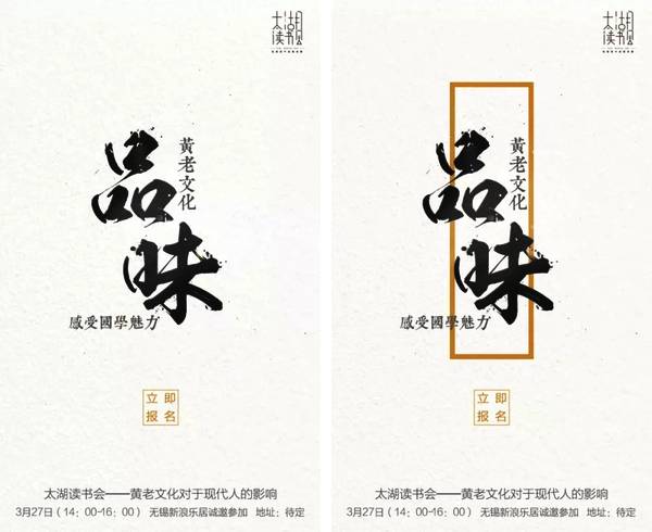 突出主題方式方式多種多樣,不僅只有留白、對(duì)比,線條同樣能起到突出主體的作用,如下圖:通過對(duì)比觀察我們發(fā)現(xiàn),右側(cè)海報(bào)整體感更強(qiáng),主題文案信息更加清晰,主體更明確;其中的原理可以理解為:因?yàn)榫€條的存在,使得主題信息有了一定的范圍,在視覺上等于是在海報(bào)中劃定了視覺焦點(diǎn),從而起到了突出主題的作用;當(dāng)然還有其他的表現(xiàn)形式。