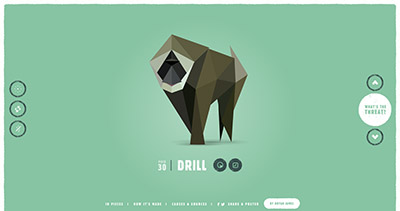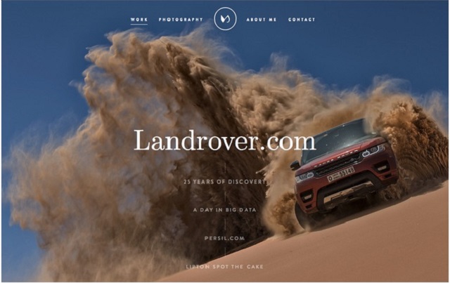 該圖的色彩對比是棕褐色沙塵與深藍色天空的強烈對比,能看到色輪,揚起的黃褐色沙塵創造了一種視覺運動路線,將你的目光指引到紅色的車身方向(也將你的視線帶往了白色文本所在位置)。這種網頁可視化設計的色彩搭配在審美上達到了一種平衡。