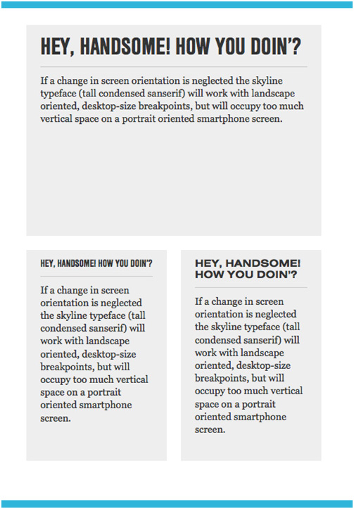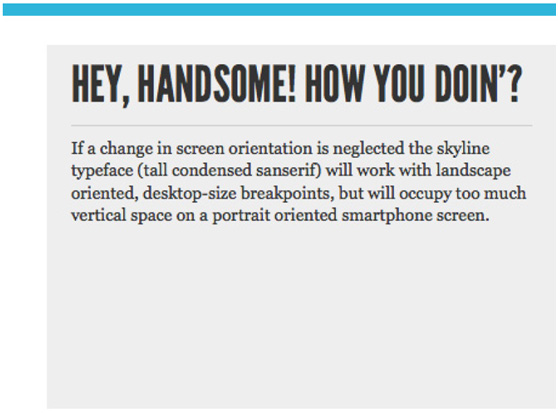 如果忽略屏幕方向和屏幕分辨率的變化,那么頂端skyline由多個字詞組成的標題(比如說瘦長的無襯線字體)應該能夠對橫向電腦桌面大小的節點起很好的作用,但在智能手機直式方向上可能會占用太多垂直空間,尤其是原文一行的標題在智能機上要轉成兩行。雖然調小字體大小來調整有一定作用,但是效果未必能比在臺式電腦的文本清晰。