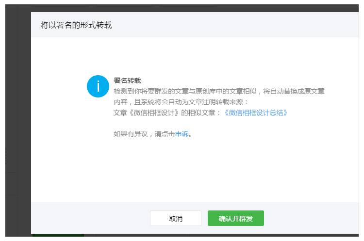 2. 設置為允許轉(zhuǎn)載的文章在群發(fā)后,其他公眾號轉(zhuǎn)載時無法修改原文章內(nèi)容及排版等,系統(tǒng)自動為轉(zhuǎn)載文章注明出處,且將默認所有公眾號獲得了作者的轉(zhuǎn)載授權(quán)。所有依據(jù)本功能轉(zhuǎn)載的文章,原創(chuàng)作者再行投訴轉(zhuǎn)載者抄襲侵權(quán)將不被支持。