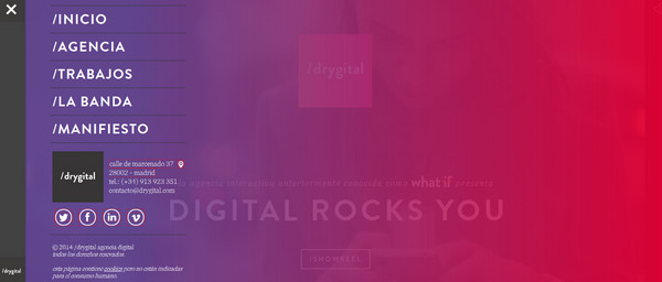Drygital的主菜單流露出歡樂積極的情感。華麗鮮艷的漸變背景,非常有利于展現亮白色的導航。一如往常,菜單覆蓋了整個主頁。不過得益于半透明的背景,用戶可以在著陸頁欣賞一段視頻。