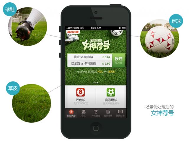 易迅彩票作為趣味化導向的產品,在保證功能簡單好用的前提下,適當的加入場景化設計,能夠很好地提升頁面的娛樂性。因為相比于傳統的單純功能性購彩頁面,通過場景化設計后的頁面更具視覺感染力和使用帶入感。因此我們在競彩足球彩種的女神推薦欄目和購彩頁面嘗試運用了場景化設計的手法。