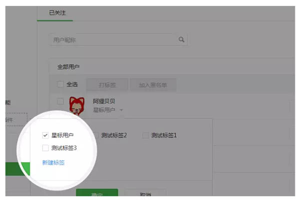 運營者可登錄公眾平臺后臺,點擊左側菜單“用戶管理”后管理已關注用戶,點擊其中一個用戶右側的“標簽”小角標可彈出復選框快速為該用戶添加標簽,且添加標簽復選框內已支持直接新建標簽。