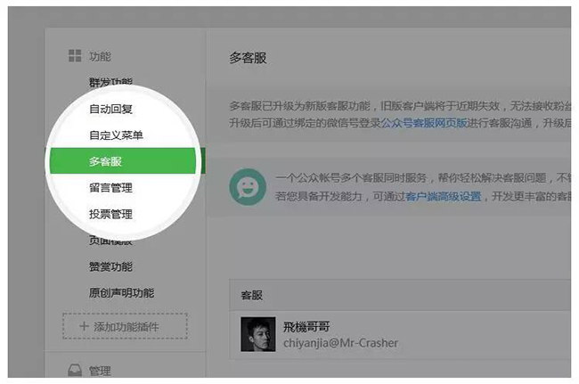在7月1日后仍未手動升級的舊版多客服的用戶,公眾平臺將自動為其升級到新版網(wǎng)頁功能,舊版多客服將失效。自動升級的用戶,需要登錄微信公眾平臺,在“功能 - 客服功能”頁面中,為客服帳號綁定對應(yīng)的客服人員微信號,綁定后才可使用網(wǎng)頁版客服功能進行客服服務(wù)。