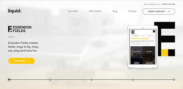 Liquid Agency 最拿手的就是在創造獨特的品牌體驗上,這一點從他們的官網上就可以看出來,黑白灰+提亮的黃色,橫向瀏覽的布局和恰到好處的留白,都是網站令人過目不忘的細節。