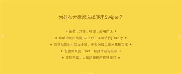 Swiper是一款免費、輕量級的移動設備觸控滑塊的js框架,使用硬件加速過渡(如果該設備支持的話)。主要使用于移動端的網站 。其實類似這樣的滑動插件的效果庫非常多,但像他這樣,文檔能做的那么專注的就很少鳥。所以推薦推薦哦!